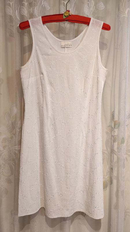 Чудова літня сукня білого кольору, бренд Modern Classics, оригінал Італія. Натуральна, екологічна "дихаюча" тканина високої якості: віскоза. Класичний,завжди в моді класичний фасон. в стилі "тиха розкіш". Принт: вишиті шовком білі квітки в тон основної тканини. Розмір європейський 12,детальні виміри на фото. Сукня нова, без паперової бірки.