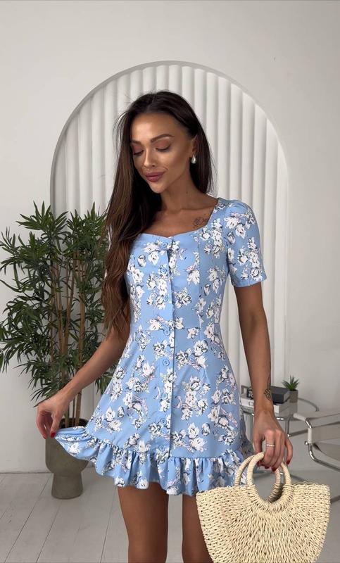 Сукня блакитна із невагомого софту у довжині міні коротка, з ніжним квітковим принтом та р...