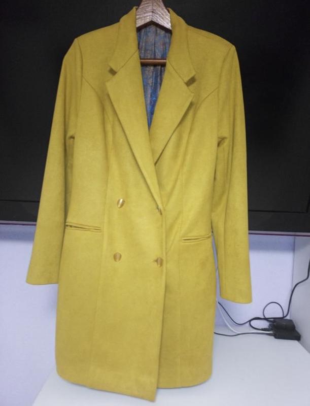 Жіноча сукня - піджак на підкладці гірчичного кольору. Можна носити як простий піджак. Матеріал – стрейтчева штучна замша. В ідеальному стані. На ґудзиках. Попереду 2 кишені. На рукавах гудзики. Відстань між пахвами 45 см. Ширина в плечах 38 см. Довжина 88 см. Довжина рукава 63 см. Ширина внизу 48 см.