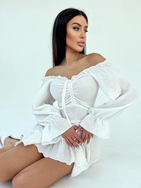 Плаття у білому кольорі виготовлене з мусліну . Верх можна регулювати куліскою , взаді є резинка . На літо саме те , оскільки вона легка та не парить . Не носила взагалі бо не вгадала з розміром . Купувала за 800 віддам дешевше.