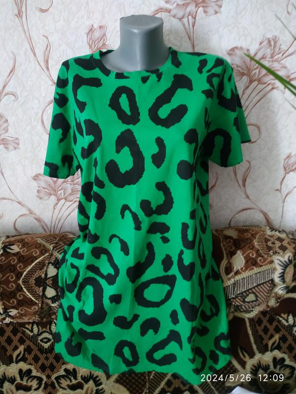 Футболка плаття з модним принтом колір на фото не передає. Полу обхват грудей та понизу 57 см, довжина 84 см. Одягалося один раз