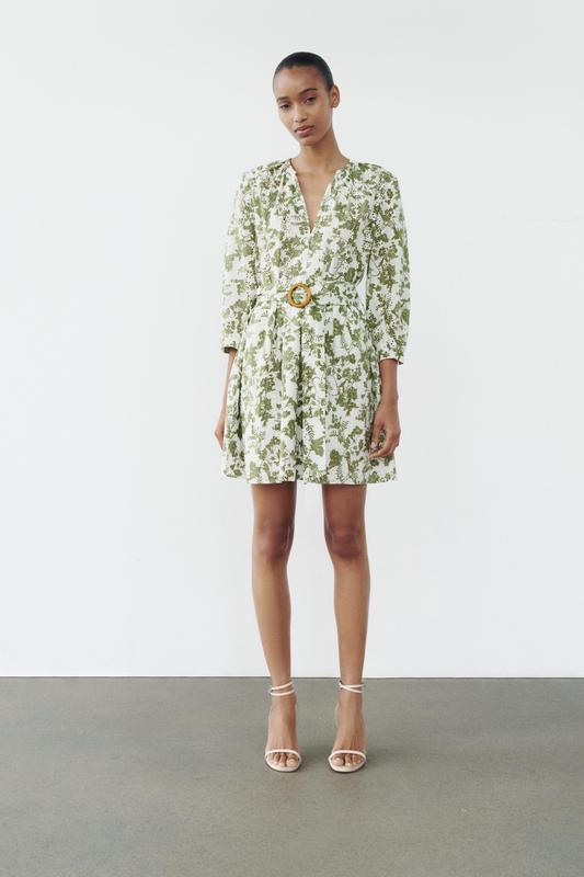 Коротка сукня з V-подібним вирізом, рукавами нижче ліктя та підкладкою. Застібається на ґудзики спереду. Пасок із тієї ж тканини на поясі. в наґвності розмір S та М ЗОВНІ 100% БАВОВНА ПІДКЛАДКА 65% ПОЛІЕСТЕР 35% БАВОВНА