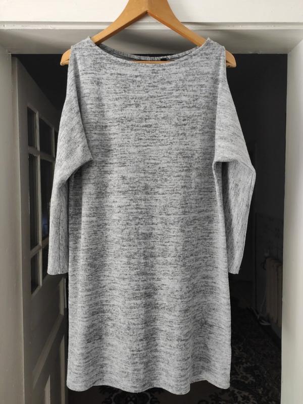Оверсайзна сукня з ніжної,як ангора тканини кольору сірий меланж,з відкритим плечем на рукаві. Пог-45 Пот-49 Поб-51 Дов.рукава-59(від горловини) Довжина сукні-89