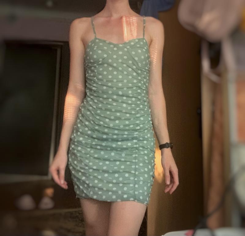Зелена в горошок, стан ідеальний. На розмір S сідає ідеально
