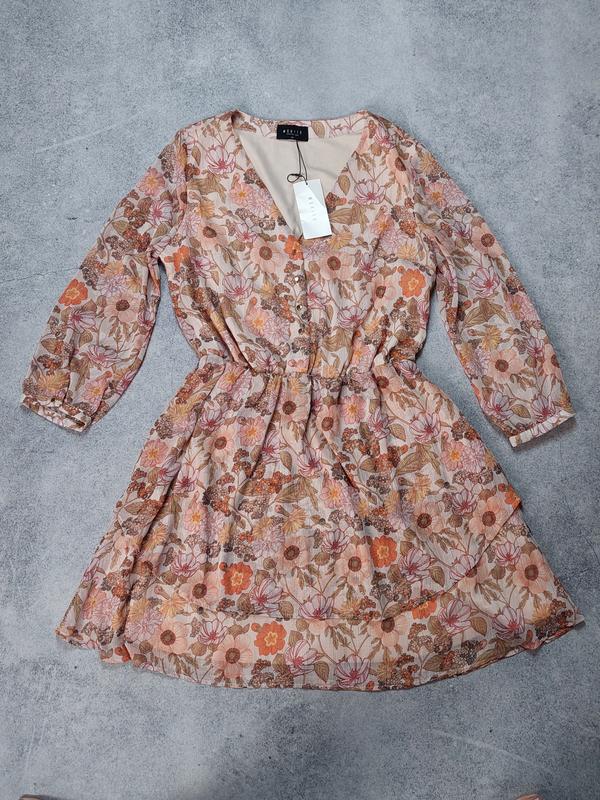 Сукня бренду Mohito.На підкладці,в талії на родзинці.Тканина 100%поліестер, з вмістом дрібних золотисто - сріблястих ниток. Є один нюанс- на рукавах одна застібка пришита спереду,друга позаду,на фото видно.