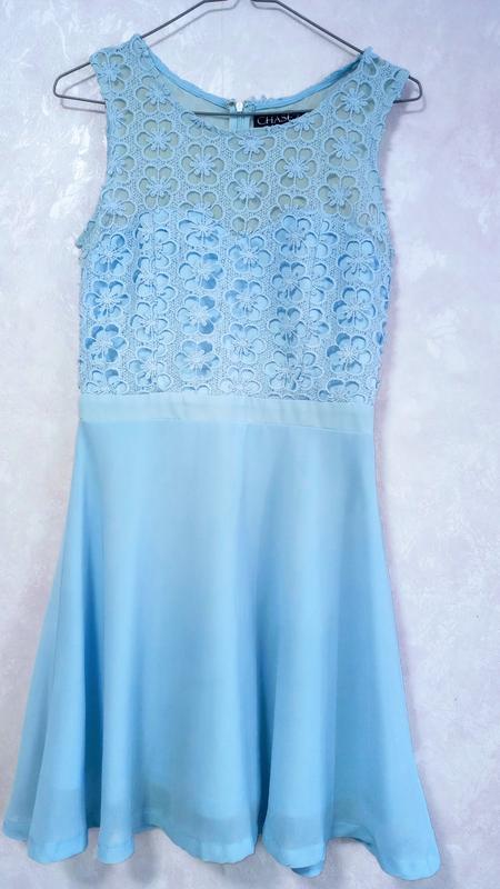 Продам романтичну сукню , неймовірно гарного небесного кольору. Низ а - силуету ,кокетка з прозорою гіпюровою вставкою. Легка повітряна тканина з шорсткою поверхнею. Вирізняється високою міцністю Полиестер 70%, Віскоза 30% Позаду таємна застібка - блискавка. Плаття в ідеальному стані, як нове. Розмір 44. Заміри: довжина 86 см, пог 39 см , пот 35 см, поб 51-56 см Розпродаж у зв'язку з переїздом. Всі речі в дуже гарному стані. За кілька позицій роблю скидку або ж безкоштовну доставку укр.поштою.