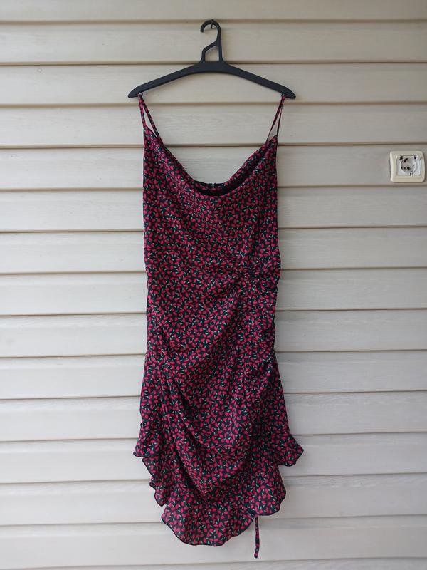 Жіноча літня сукня з принтом квітів на тонкій брительці зі збірками збоку Брителі корегують довжину. Об'єм грудей-92 см; Об'єм талії - 84 см; Довжина з брителями- 114 см.