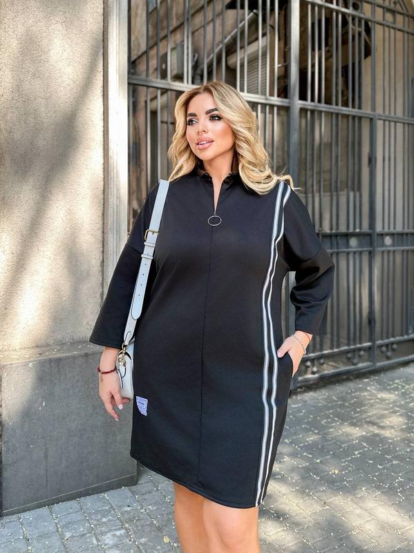 Колір: чорний. Розмір: 42-46,48-52 Тканина: «італійський трикотаж». Оздоблення сукні (нашивка, лампас, блискавка ) може відрізнятись. 0595 42-46 Об г - 110 Об б - 112 Дл и - 90 Дл р - 31 48-52 Об г - 116 Об б - 118 Дл и - 93 Дл р - 31
