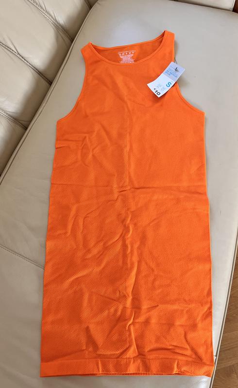 Новое платье, ткань напоминает спандекс, хорошо тянется, как в одежде для спорта. Тканина в рубчик