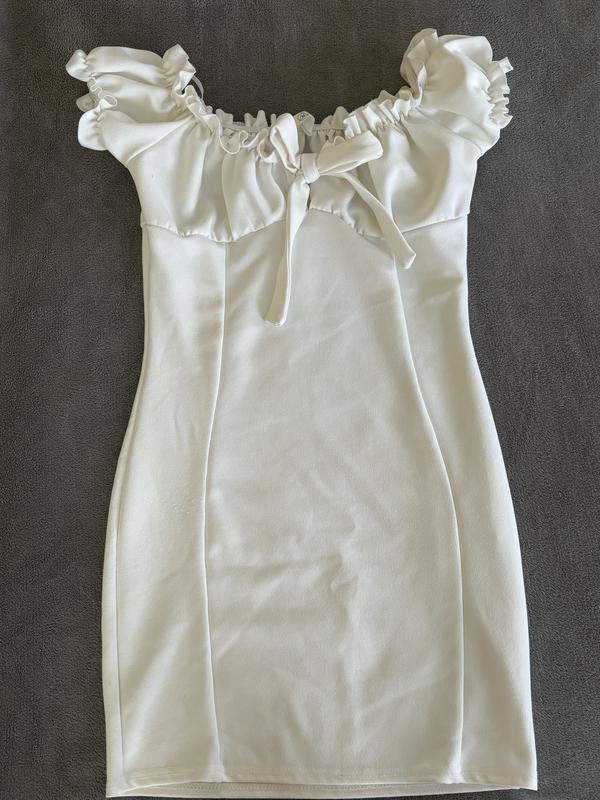 Белое приталенное платье. Ткань хорошо тянется, плечи на резинке. Спереди платье на завязке. Размер XS-S