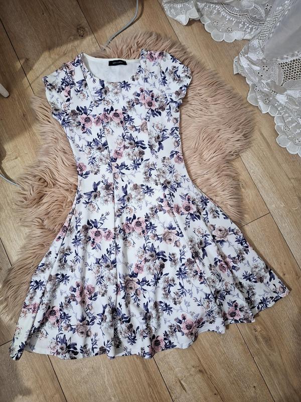 Нежное платье от New Look Фактурная ткань Цветочный принт Пышная юбка Рукав короткий Красивые выточки по талии Подчеркивает фигуру Размер S-M Как новое