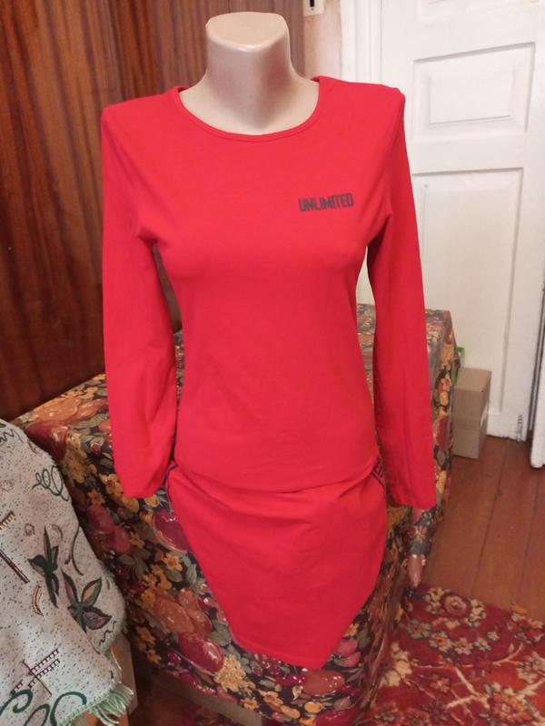 дуже гарна плаття з надписями по бокам. Бірки немає, тканина катон, приємна до тіла і добре тягнеться. Розмір с, м, л. опис стан отлічний довжина 88 рукав 60 ширина груді 39 ширина бедер 42
