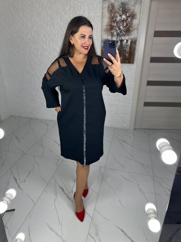 ✅✅✅НОВИНКА Плаття Модель 986VL Розміри : 46-48,50-52,54-56,58-60,62-64 Колір : чорний Тканина : крепкостюмка , сітка Плаття вільного крою , рукав три четверті , з боків кишені , на плечах декоративна сітка , плаття прикрашене бархатною стрічкою на плечах та спереду. Параметри моделі-норми ОГ98, ОТ76, ОС106, зріст 170см , на ній одягнений розмір 46-48; параметри моделі-батал Інни ОГ110, ОТ86, ОС112, зріст 165см , на ній одягнений розмір 50-52. Заміри виробу : Розмір 46-48: Обʼєм грудей 120 Обʼєм талії 110 Обʼєм стегон 112 Довжина рукава від горловини 59 Довжина по спинці 98 Розмір 50-52: Обʼєм грудей 124 Обʼєм талії 118 Обʼєм стегон 120 Довжина рукава від горловини 60 Довжина по спинці 100 Розмір 54-56: Обʼєм грудей 132 Обʼєм талії 124 Обʼєм стегон 128 Довжина рукава від горловини 62 Довжина по спинці 101 Розмір 58-60: Обʼєм грудей 136 Обʼєм талії 132 Обʼєм стегон 136 Довжина рукава від горловини 62 Довжина по спинці 104 Розмір 62-64: Обʼєм грудей 144 Обʼєм талії 138 Обʼєм стегон 144 Довжина рукава від горловини 62 Довжина по спинці 104см