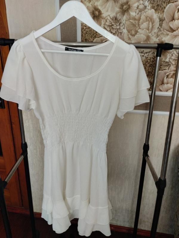 Платье в цвете айворе на широкой резинке по талии, закругленная пройма спереди, нежная с двойной оборкой, низ платья расширен и заканчивается двойной оборкой.Ткань легкая как летний ветерок.