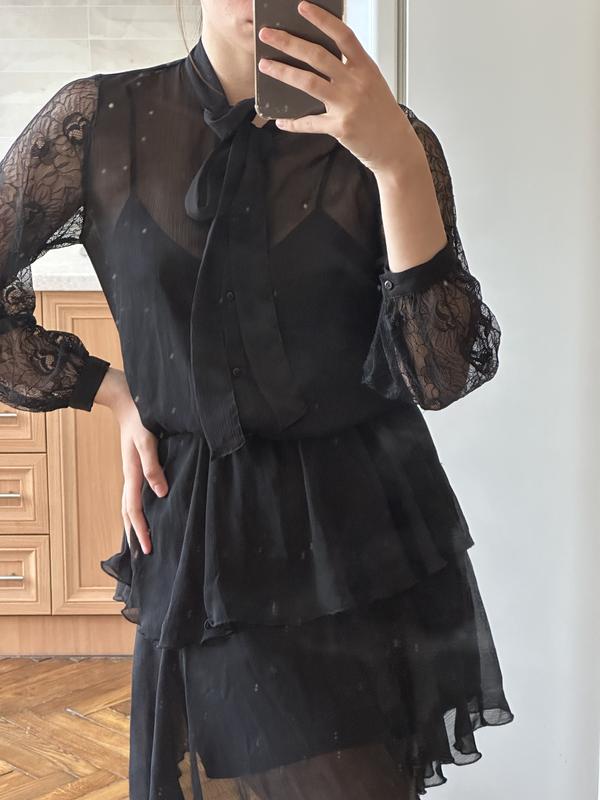 Чорна жіноча сукна, рукава з мережива, спереду можна завʼязати бант чи позаду, підійде як на вечір так і на повсякденну носку