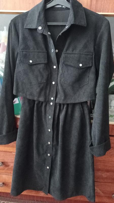 сукня-обманка,одягнула 1 раз,малувата. гарно сяде на наш 46розмір. заміри за запитом. тканина вельвет, рубчик. осінь-весна,бокові кишені діючі, верхні також.защібається на кнопки. манжет на рукавах з підворотом. без недоліків.