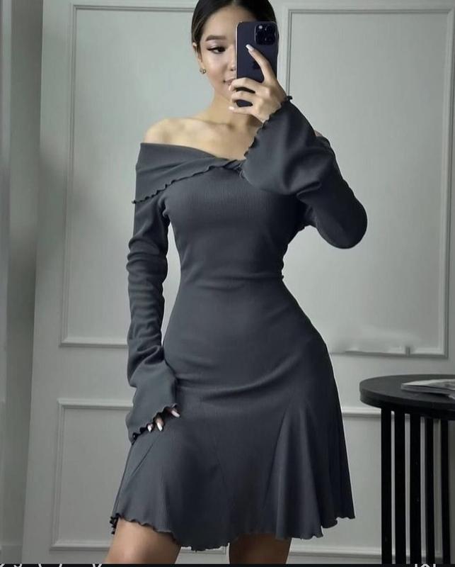 виробу Вечірнє плаття Фасон сукні Міні Стиль Романтичний Колір Графіт Сезон Всесезонний Тип тканини Рубчик Фасон вирізу горловини Фігурний Фасон рукава Розкльошений Властивості тканини Еластичність висока / Стрейч Візерунки і принти Без візерунків і принтів Довжина сукні Коротке / міні Довжина рукава Довгий
