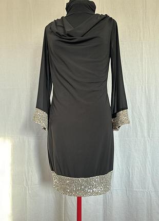 Ошатна міні сукня чорна, прикрашена манжетами з сріблястими паєтками. Виглядає святково. Розмір М. Основа сукні не прозора, щільна без підкладки. Має ворот шалик і прозорі рукава( див фото) Ног 45 довжина 94 рукав 56 см При замовленні без торгу, маю в наявності подарунки : 1. Сріблясті босоніжки 37 або 39 розміру, АБО , якщо взуття не потрібно , 2. Сумочку сріблясту на ланцюжку, Вишлю у подарунок. Фото взуття чи сумки за запитом. Сток. На фігурі фото немає.