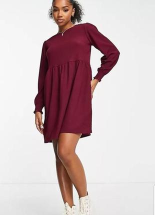Модне плаття в кольорі марсала зі структурованої тканини від New Look. Легке, вільне, з трохи завищеною талією і красивим кроєм рукава. У стані нового. Розмір 12. Довжина 85 см. НОГ 51 см. НОТ 45 см. НОС вільний. Рукав 62 см. Добре тягнеться.