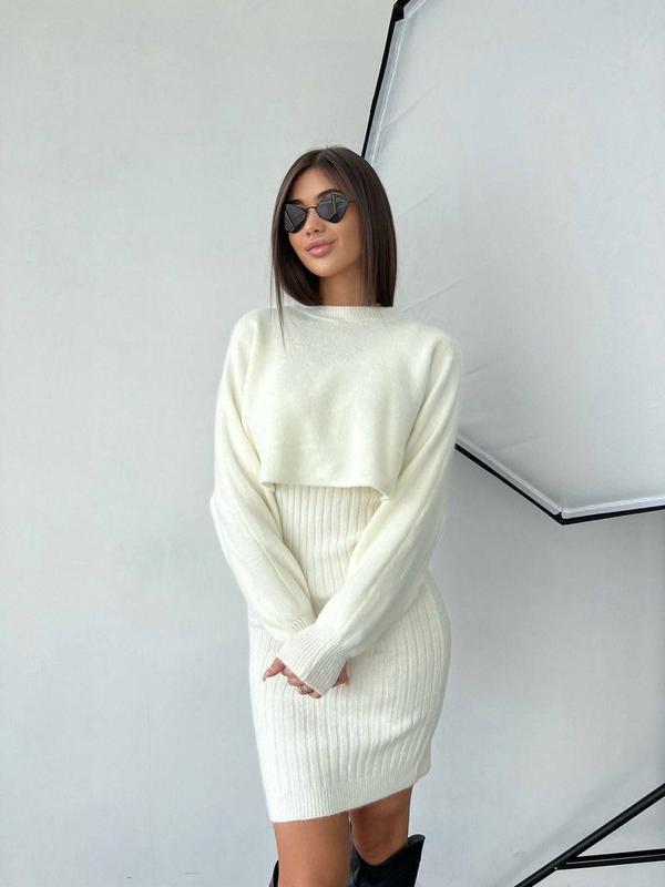 ‼️Новинка‼️ Модель 5801👆👆👆кост Сукня + кофтинка Розмір єдиний 44-48 Тканина щільна машина в'язка Виробництво фабричний Китай 1050 грн Сукня: Довжина виробу 90 см Ог 79 см +тягнеться до 120 см Кофтинка: Довжина виробу 43 см Довжина рукава від горловини 72 см