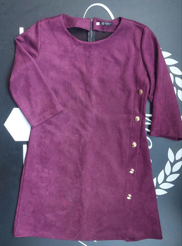Елегантна жіноча сукня з декоративними золотими ґудзиками збоку, має насичений бордовий колір, схожий на темно-фіолетовий або сливовий відтінок. Сукня виконана з м'якої тканини, типу еко-замші, з рукавами три чверті. Застібається на блискавку ззаду. Ця модель підійде для теплого сезону, як для офісу, так і для неформальних заходів. Плечі - 42см Напівобхват грудей - 51см Довжина - 88см