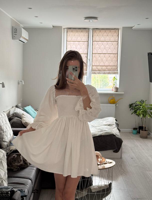 Біла сукня Рукав ліхтарик Талія розтягується до 44 см Довжина спідниці 48 Довжина сукні 66 см Розмір хс - с Тканина льон