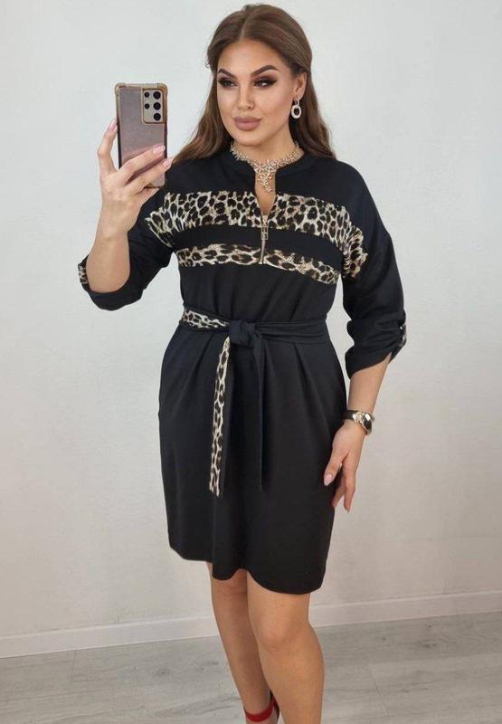 Платье Модель 989VL Размеры : 42-46, 48-50,52-54,56-58,60-62 Ткань : дайвинг Цвет: черный Платье -туника с интересным кроем, свободный крой, леопардовые вставки, рабочая молния на груди, длинный рукав с патиком на пуговице, что дает возможность регулировать длину рукава. Свободный силуэт можно регулировать поясом и подчеркнуть талию, по бокам два кармана. Параметры модели-нормы ОГ90, ОТ68, ОБ96, рост 170см, на ней одет размер 42-46; параметры модели-балталл ОГ112, ОТ88, ОБ112, рост 165см, на ней одет 52-54 Замеры изделия: Размер 42-46: Объем груди 106 Объем талии 100 Объем бёдер 102 Длина рукава от шва 43см Длина 86см Размер 48-50: Объем груди 120 Объем талии 110 Объем бёдер 112 Длина рукава от шва 43см Длина 90см Размер 52-54: Объем груди 126 Объем талии 116 Объем бёдер 118 Длина рукава от шва 44см Длина 92см Размер 56-58: Объем груди 132 Объем талии 122 Объем бёдер 124 Длина рукава от шва 45см Длина 96см Размер 60-62: Объем груди 142 Объем талии 132 Объем бёдер 136 Длина рукава от шва 46см Длина 100см