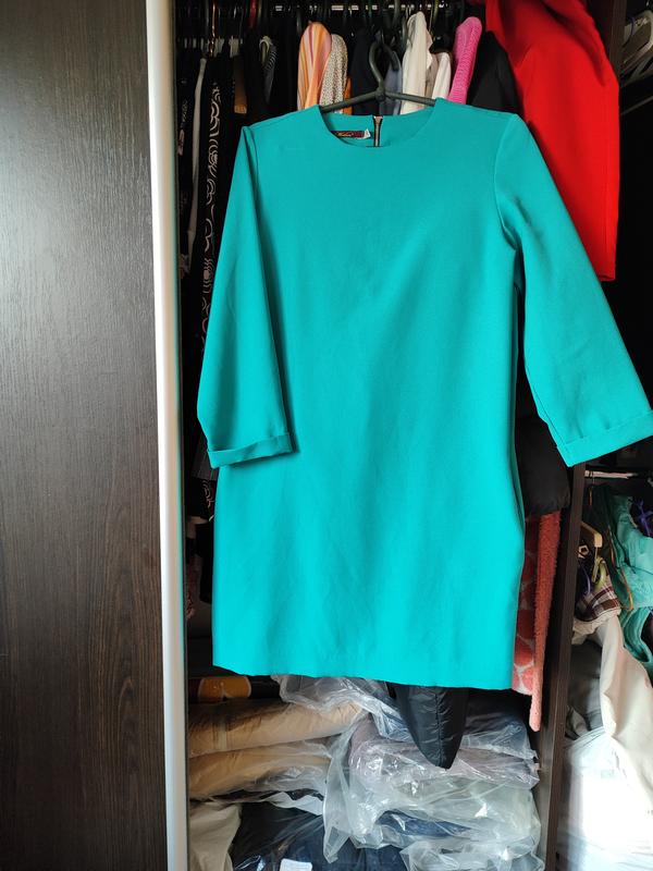 Стильне плаття, класичне, бірюзового кольору, фото нажаль не передає всю його красу, без принту, без малюнків, по бокам невидимі карманчики, рукав три четверті. Матеріал не тягнеться. ПО грудей - 50 см ПО талія та бедра - 49 см Довжина - 85 см Рукав - 48 см