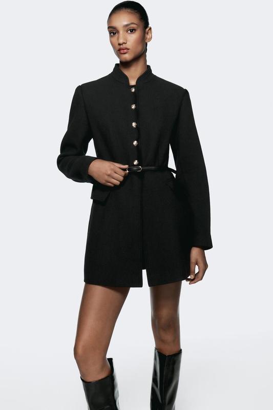 Ціна 2920 Пальто з вовни. Високий комір і довгі рукави з підплічниками. Передні кишені з клапаном. Застібка спереду з тисненими золотими ґудзиками та поясом. Чорний | 3046/341