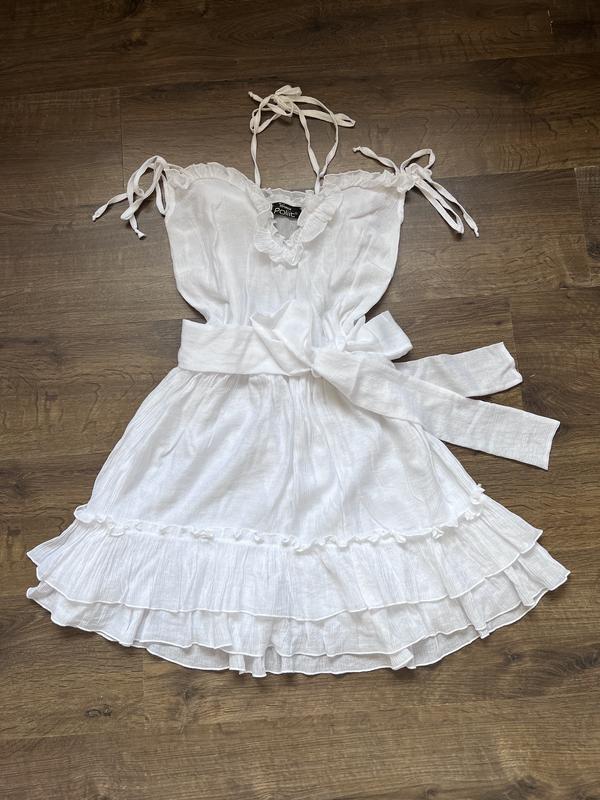 Лялькова сукня в стані нової білого кольору з переливом з пояском. Підійде на розмір XS, S. Тканина зблизька на крайньому фото.