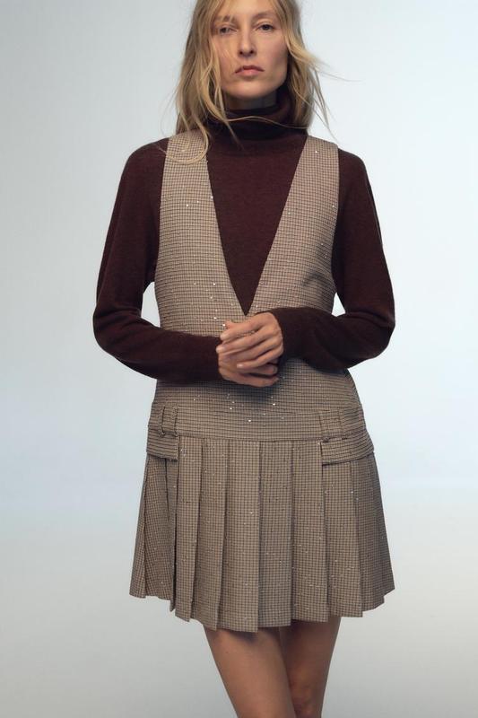 Ціна 2350 Сукня з яскраво вираженим V-подібним вирізом і рукавами з проймами. Фальшиві передні кишені з клапаном і плісирований край. Аплікація з паєток. Багатобарвний | 6962/229