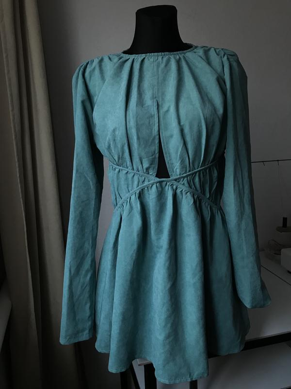 Фірмова сукня, на розмір С. Тканина приємна, схожа типу під замш. Кольір ніжно зелений. Спереду на грудях є виріз, при хотьбі і руках нічого не випадає і нічого не видно. На спині є застібка з блискавки і ґудзика на шиї. Сукня нова, але без бірки!