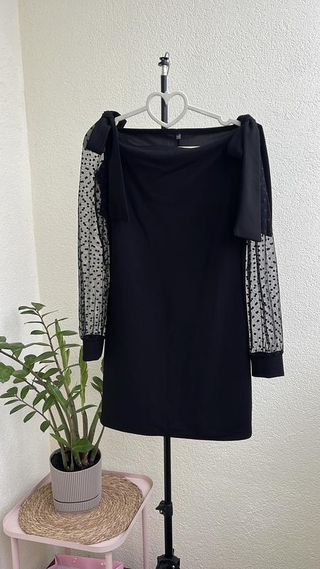 Чорна приталена сукня з руковом-сіточкою. на плечах завʼязки. Чудовий варіант на щодень та на якусь подію