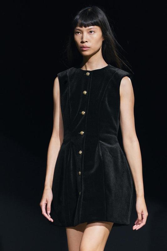 Цена 3150 Женская КОЛЕКЦИЯ ZARA Короткое платье из бархата. Рукава с круглой горловиной и проймами. Низкая баска. Застежка спереди на металлические пуговицы с тиснением. Черный <unk> ************