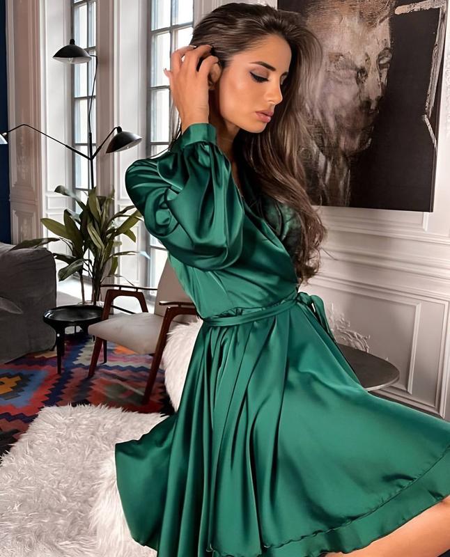 Женское шелковое короткое платье на запах с поясом с расклешенной юбкой солнцем и широкими...