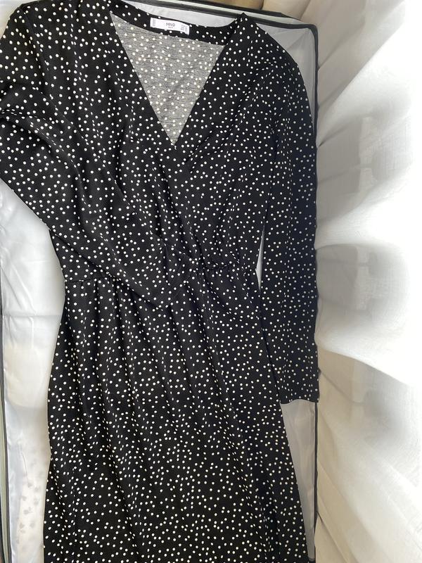 Платье с V-образным вырезом, талия на резинке; легкая ткань, черная в молочный горох, универсальное на любую фигуру, состояние хорошее, длина выше колена