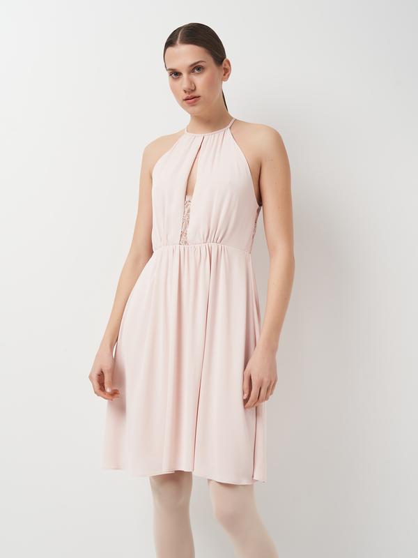 Короткое платье легкой ткани, узкого кроя вверху с разрезом спереди и кружевной вставкой. Шнуровка сзади с разрезом и пуговица на шее сзади. Шов на талии и присборенная нежно-колоколообразная юбка. Возможно повреждение бирки 0497751_роз_10
