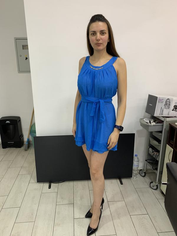 Платье легкое короткое с поясом. Можно носить с поясом или без. Свободного фасона. Указан размер L Замеры: Полуобхват груди - 54 см Длина - 80 см