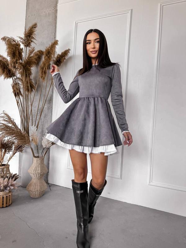 Стильна та романтична,сукня: оброблена французским мережевом, застебається змійкою на спінці, спідниця прибрана, солнцеклеш, + знімна біла спідниця з мережевом💝 Тканина: замш на дайвингу(тягнеться) з доданням білого котону (бавовни), Виробництво: Туреччина Колір: графіт, чорний Розмір: с-м(42-44), мл (46-48) Ціна: 775 грн