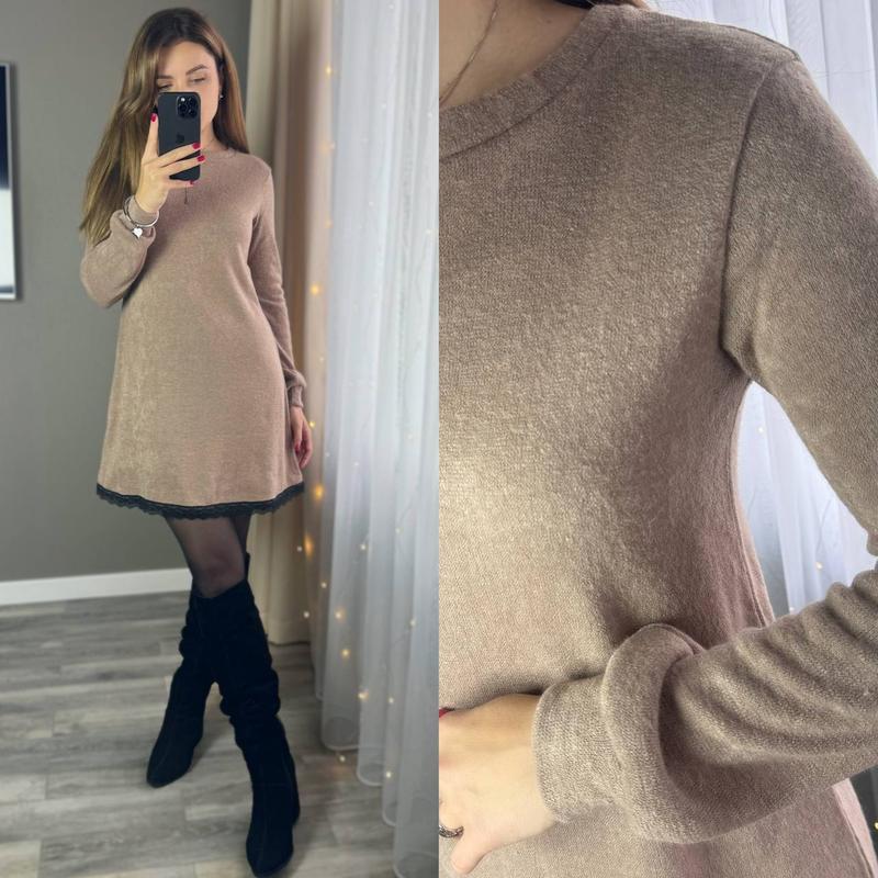 Плаття арт. ha2. 2480 Тканина: ангора «Арктика» Колір: мокко,, чорний Розмір: 52-54, 56-58 Плаття з мʼякої, теплої ангори, дуже добре тягнеться, не кошлатиться. Оздоблено по низу мереживом, горловина кругла, рукав на манжеті.