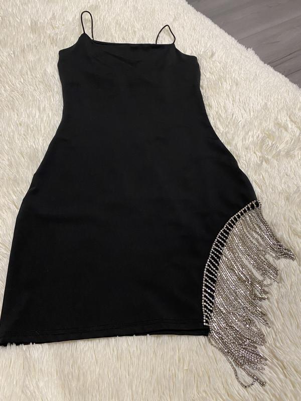 Очень крутое платье, с бахромой из стразов которые очень качественные и яркие. Платье в размере s, мини. На комоде двойная ткань не светится. Идеальное платье на все случаи жизни.