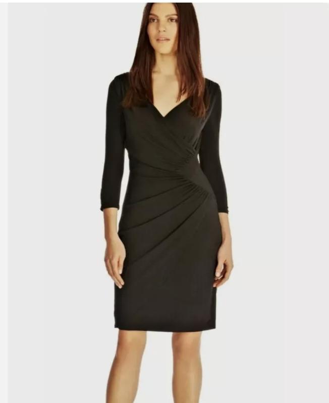 Маленьке чорне плаття розмір М,L, поліестер і еластан, чорного кольору, імітація запаху, застібка в бічному шві, розтягується, гарний стан, слідів шкарпетки немає, все ціле, на зріст 165 см довжина до коліна.