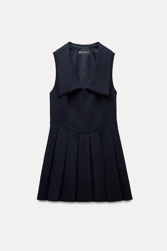 Ціна 2550 Сукня коротка приталена з коміром-стійкою з мереживом в тон. V-подібний виріз і безрукав. Бокові кишені та низ, оброблений складками. Бокова застібка з прихованою блискавкою в шві. Темно-морський | 2124/550/422