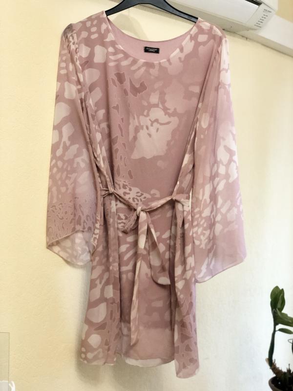 Сукня ніжного кольору «попіл троянди» в відмінному стані. Надягала один раз. На підкладці. Тканина шифон. Довжина 88 см. Плечі 44 см. Рукав розширений 58-64 см; ПОГ 54 см. ПОБ до 60 см- тканина гарно спадає донизу. Має поясок.