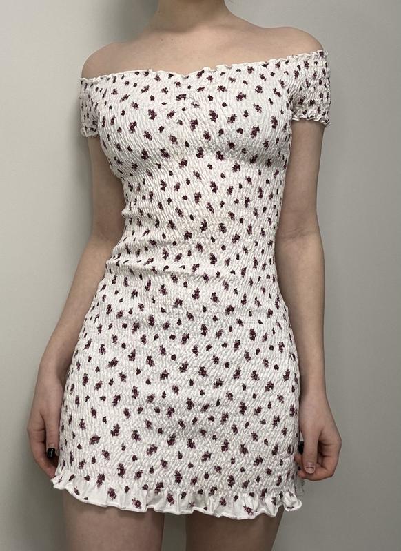 біла обтисла сукня в квіточку pull&bear з еластичного матеріалу, довжина 60 см, дуже коротка але тягнеться. Є маленька майже не видима жовтувата пляма в районі грудей. Вдягнена на параметри 80-64-88. Вдягнена 1 раз, стань майже ідеальний