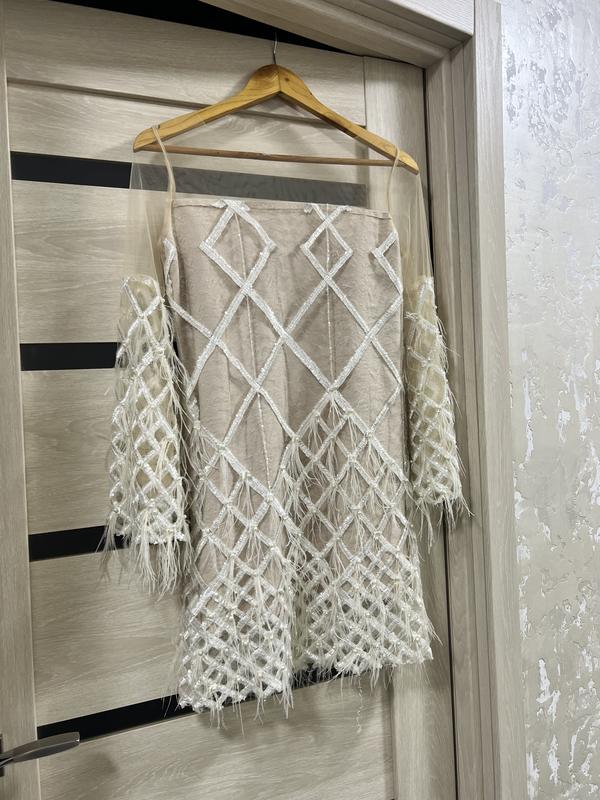 Плаття з перлинками і натуральним пір’ям. Колір бежевий, ідеальний стан. Одягнене було один раз. Розмір s-m