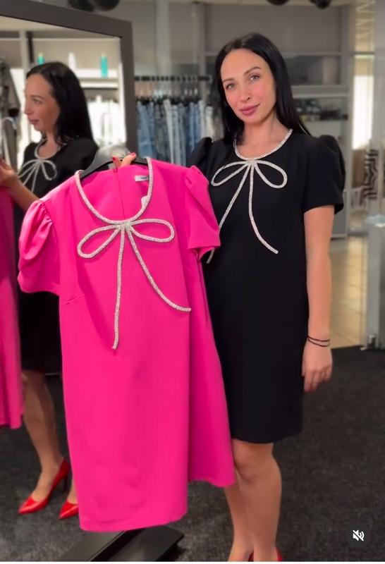 Сукня з яскравим бантом стилізована камінням яке дуже яскраво переливається на світлі, є кармани. В двох кольорах чорному в рожевому, виробник Туреччина, якісна костюмна тканина. Розмірна сітка від 36(s) до 42(l) розміру. Зараз за крутою ціною