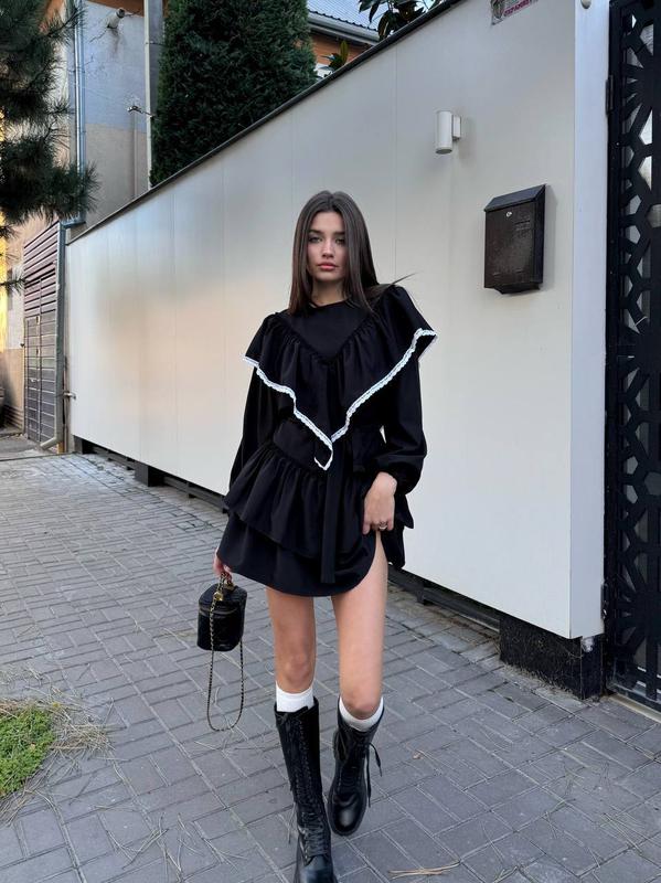 Сукня Мод: 1026-0279 ▪️Розмір: 42-46 ▪️Тканина: єврокостюмка, оздоблена білим лляним мереживом Пояс у комплекті ▪️Колір: чорний