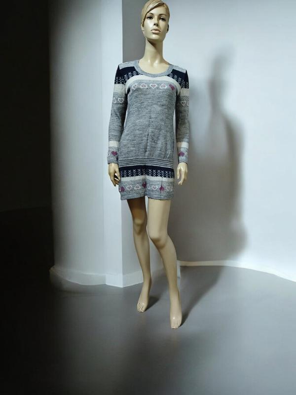 Симпатична сукня турецького виробництва машинної в'язки, сірого кольору, в дуже хорошому стані, трохи кашлатається. Довжина виробу по спинці від плеча 85 см, напівобхват грудей 45 см, напівобхват талії 39 см, напівобхват стегон 46 см, довжина рукава 58 см. Тканина тягнеться. Модель 5756