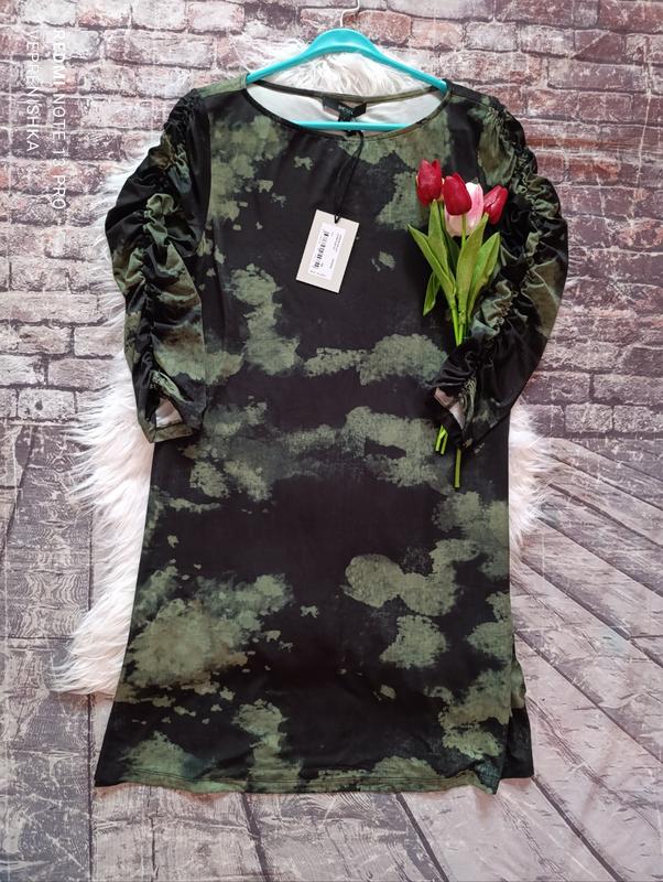 Сукня в камуфльований принт Shendel. Розмір 14(42) 95% віскоза, 5% еластан на рукавах резинки Заміри: ПОГ 48см, тягнеться до 56см; ПОТ 49см, тягнеться до 57см; ПОБ 57см, тягнеться до 62см; довжина від плеча 91см; плечі 37см; рукав 43см